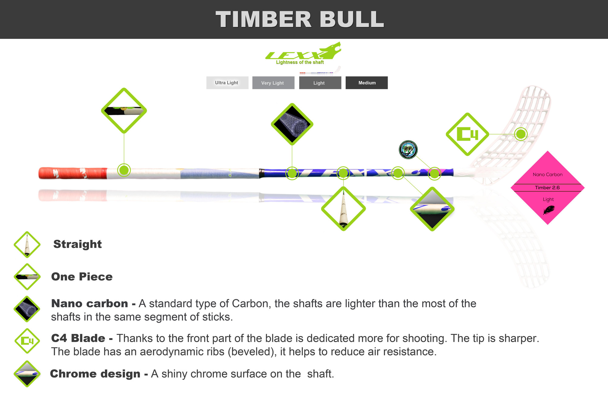 Čepel je odlehčená, která je oproti jiným čepelím jinak vyvážená - má posunuté těžiště, a tak dribling čepele je velmi snadný. Podobně jako střelba.