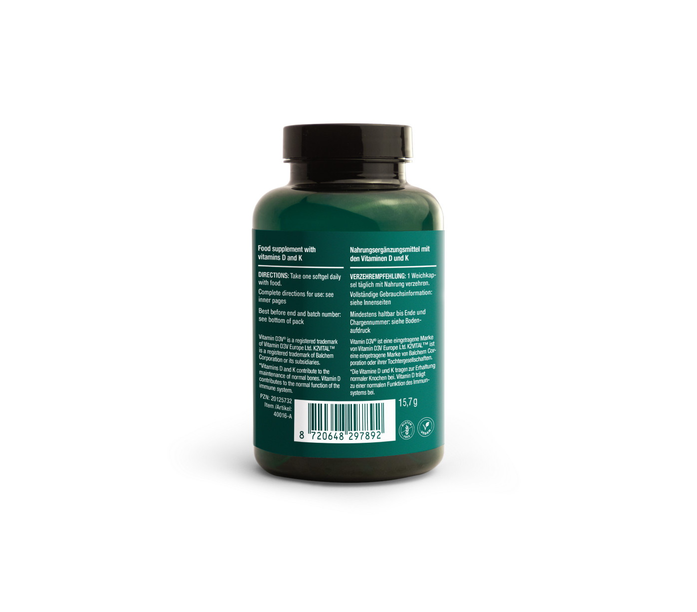 SLOŽENÍ: Triglyceridy se středně dlouhým řetězcem • obal kapsle (hydroxypropylškrob, zvlhčující látka: glycerol, voda) • menachinon • cholekalciferol non-GMO Vitamin D3V® je registrovaná ochranná známka společnosti ProTecNutra Ltd. K2VITAL® je registrovaná ochranná známka společnosti Balchem Corporation nebo jejích dceřiných společností