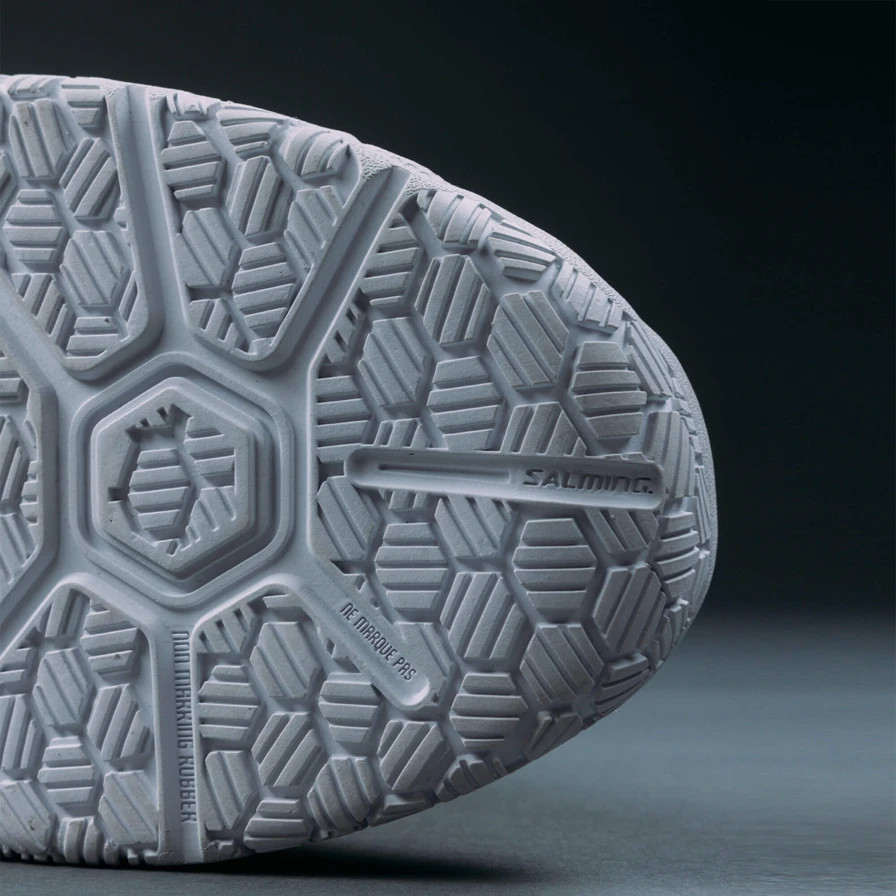 Přední část podrážky je konstruována s maximální ohledy na ohyb boty při prakticky všech myslitelných změnách směru. Stabilitu při nich ještě umocňuje speciální vzorek Salming HexaGrip™ tvořený malými šestiuhelníky. Ten zároveň zajišťuje i perfektní grip.
